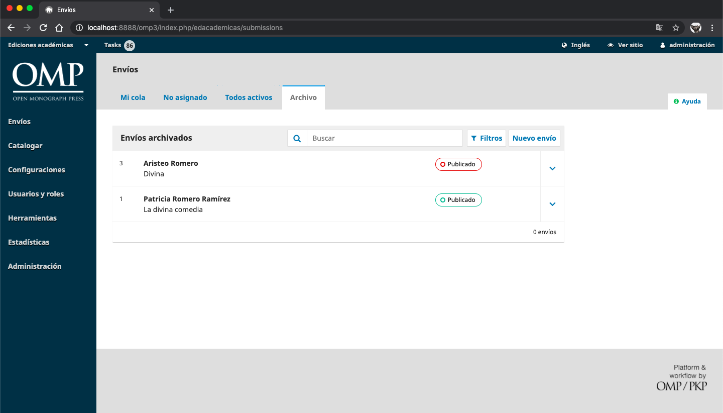A esta esta sección solo podrán acceder los editores y el administrador del sitio. Dentro de ella podrán encontrar todos los envíos que aún no hayan sido publicados y que no se encuentren rechazados.