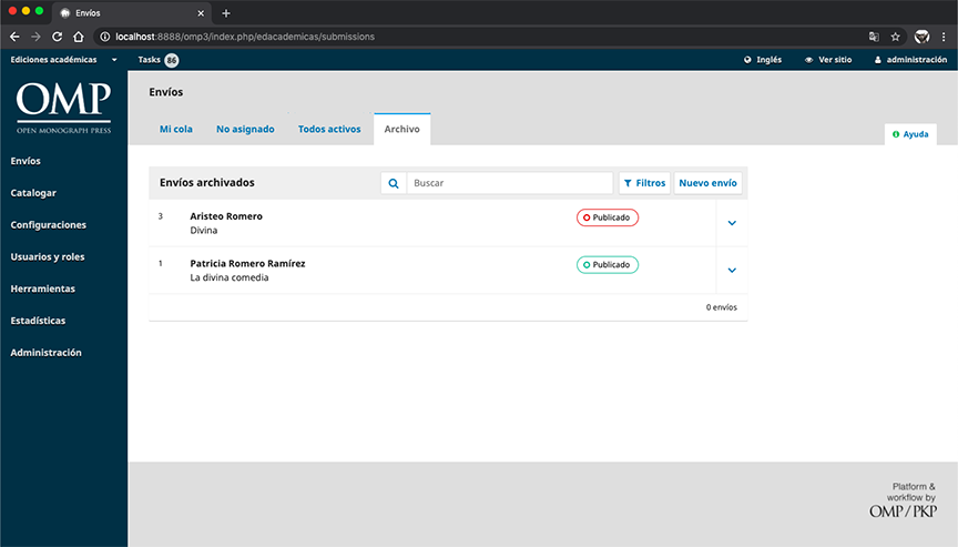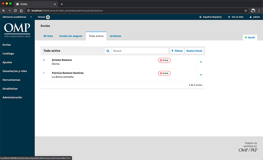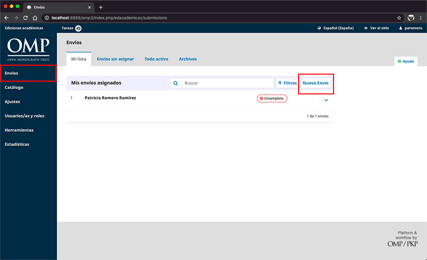 En este apartado podrá realizar el seguimiento de las tareas que tenga asignadas o de los envíos que haya realizado como autor, según el rol que tenga en la editorial.