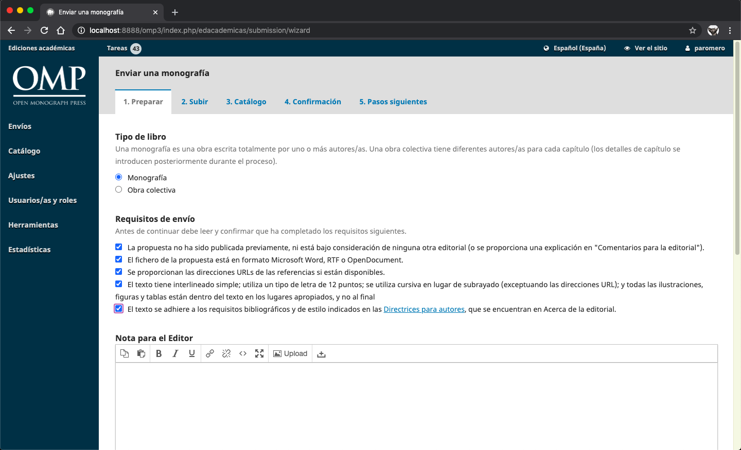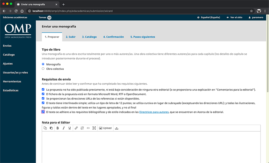 En un principio, se le solicitará establecer el tipo de libro del que se trata, sea una monografía o una obra colectiva. Posteriormente, deberá verificar y marcar todos los elemento en la lista de Requisitos de envío para poder continuar. Si desea añadir alguna especificación, antes de guardar y continuar puede agregar una nota para el editor.